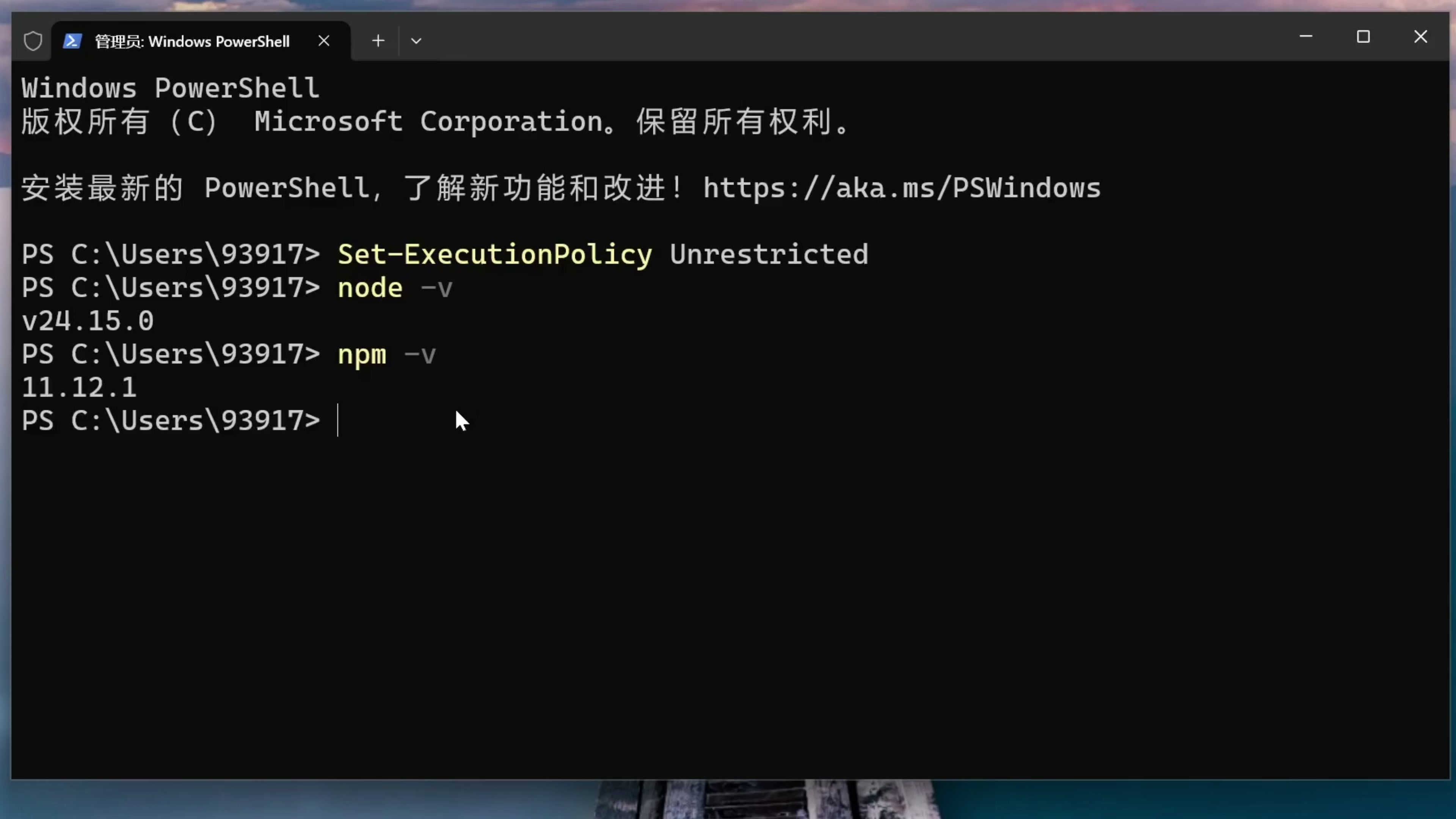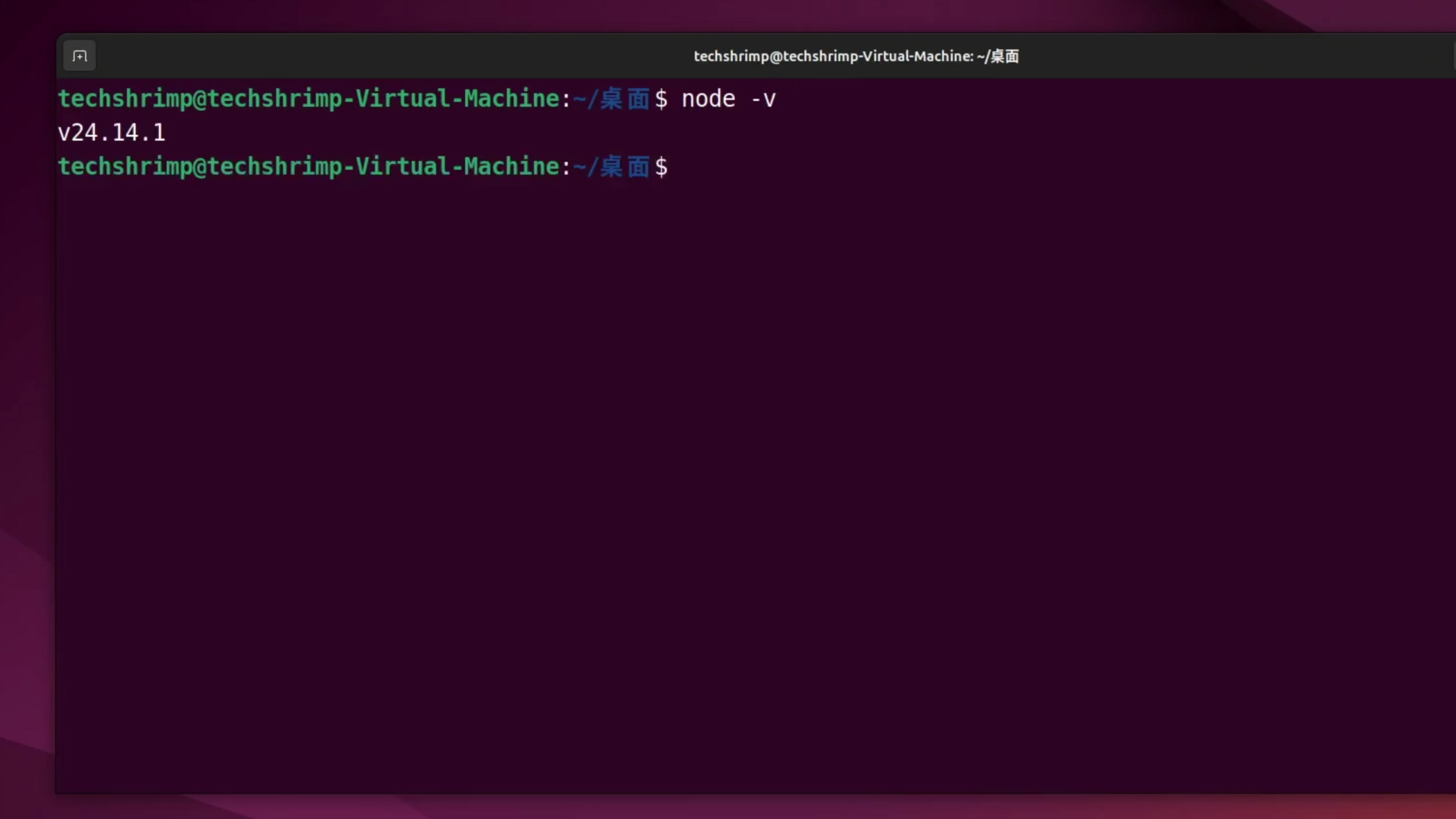 然后我们输入 node -v 验证一下,这里显示了版本号,我们的 nodejs 就安装完成了。