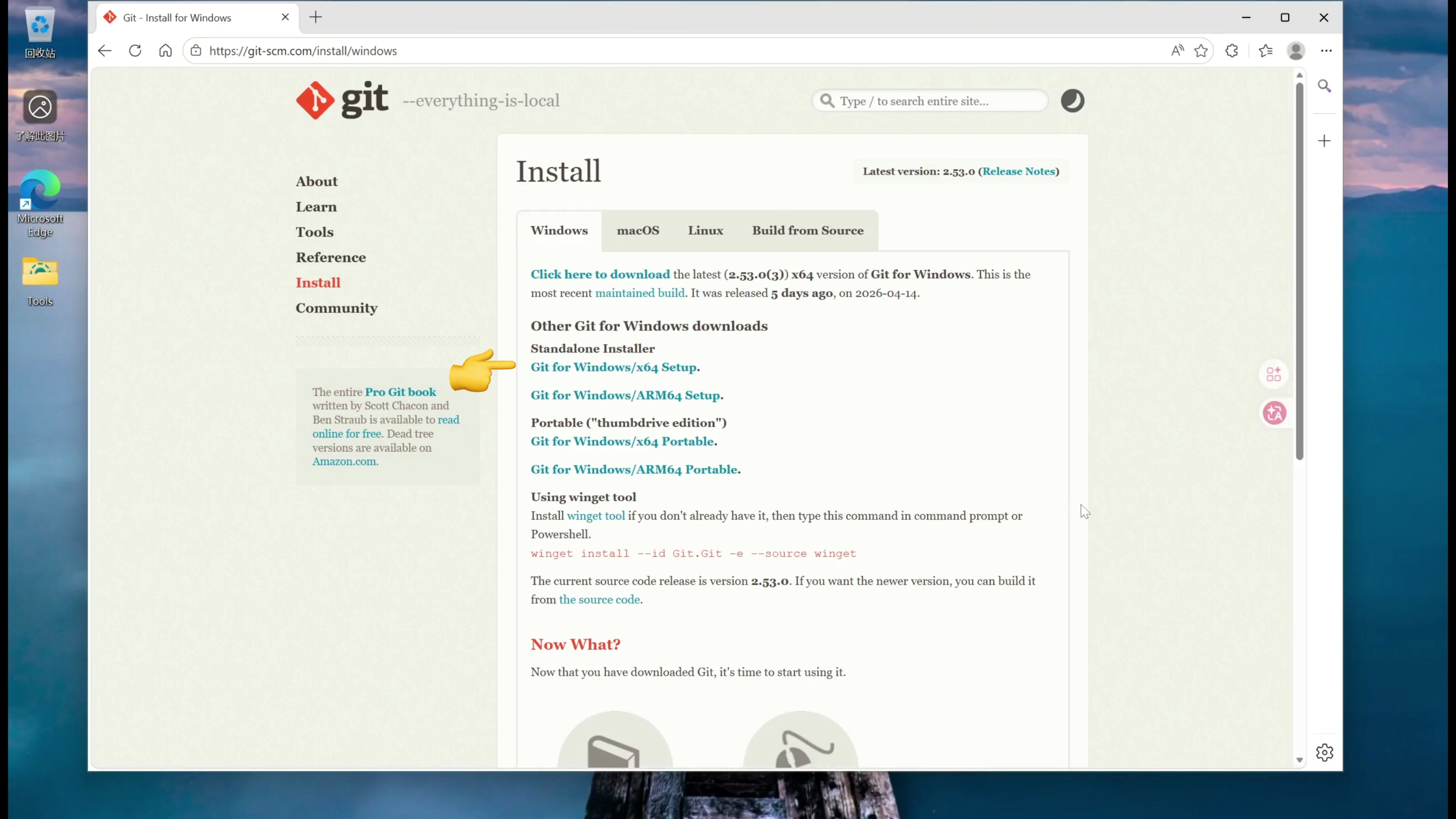 点击下载 Windows 系统的安装包。根据自己的 CPU 架构选择 X86_64 位还是 arm 架构的安装包,一般 Windows 电脑的 CPU 架构都是 X86_64 位的。 一般选择 Git for Windows downloads 。