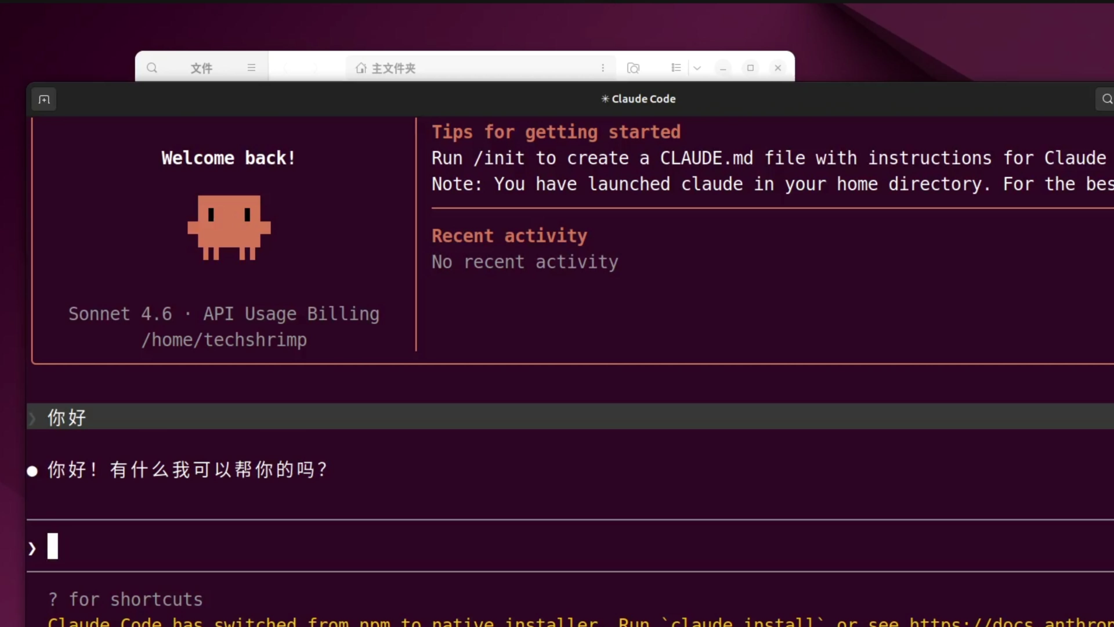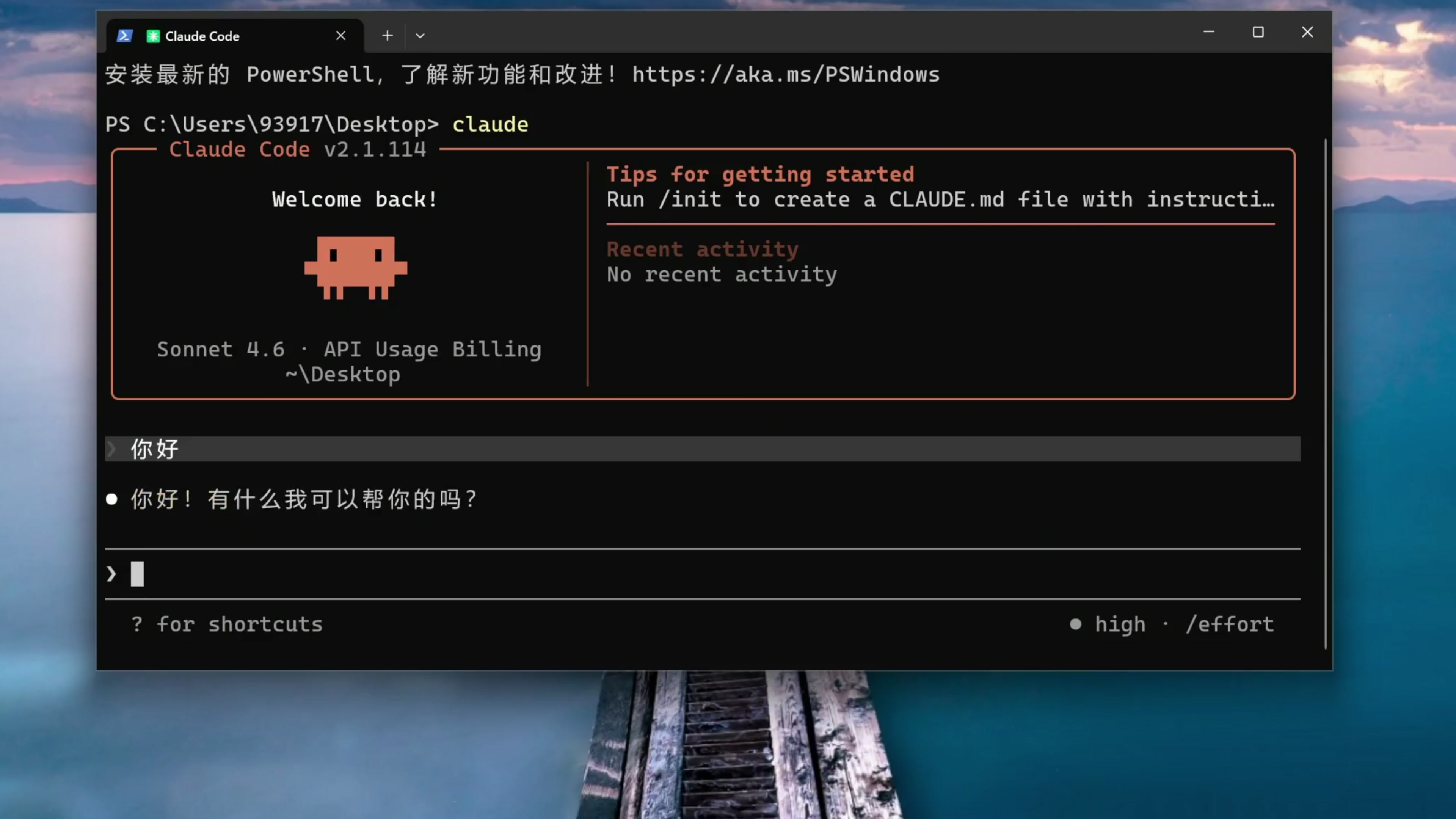 按 Ctrl+S 保存一下这个配置文件,然后关闭。我们还是来到桌面,右键在终端打开,然后输入命令 claude 来启动 Claude Code 。打个招呼,这里给到了回应,我们就配置完成了。