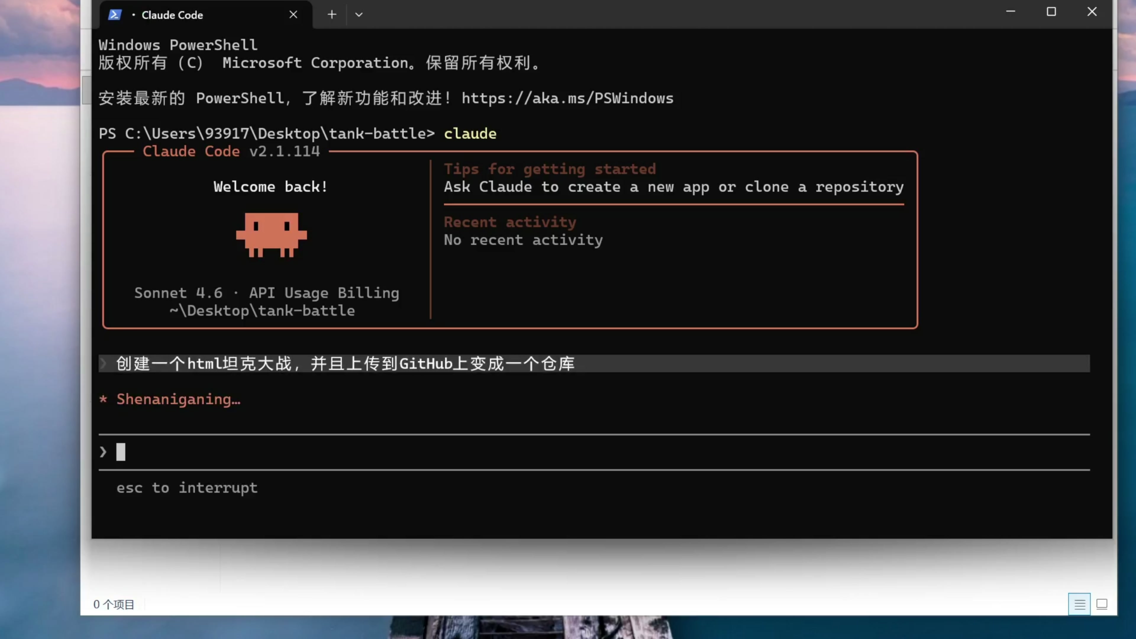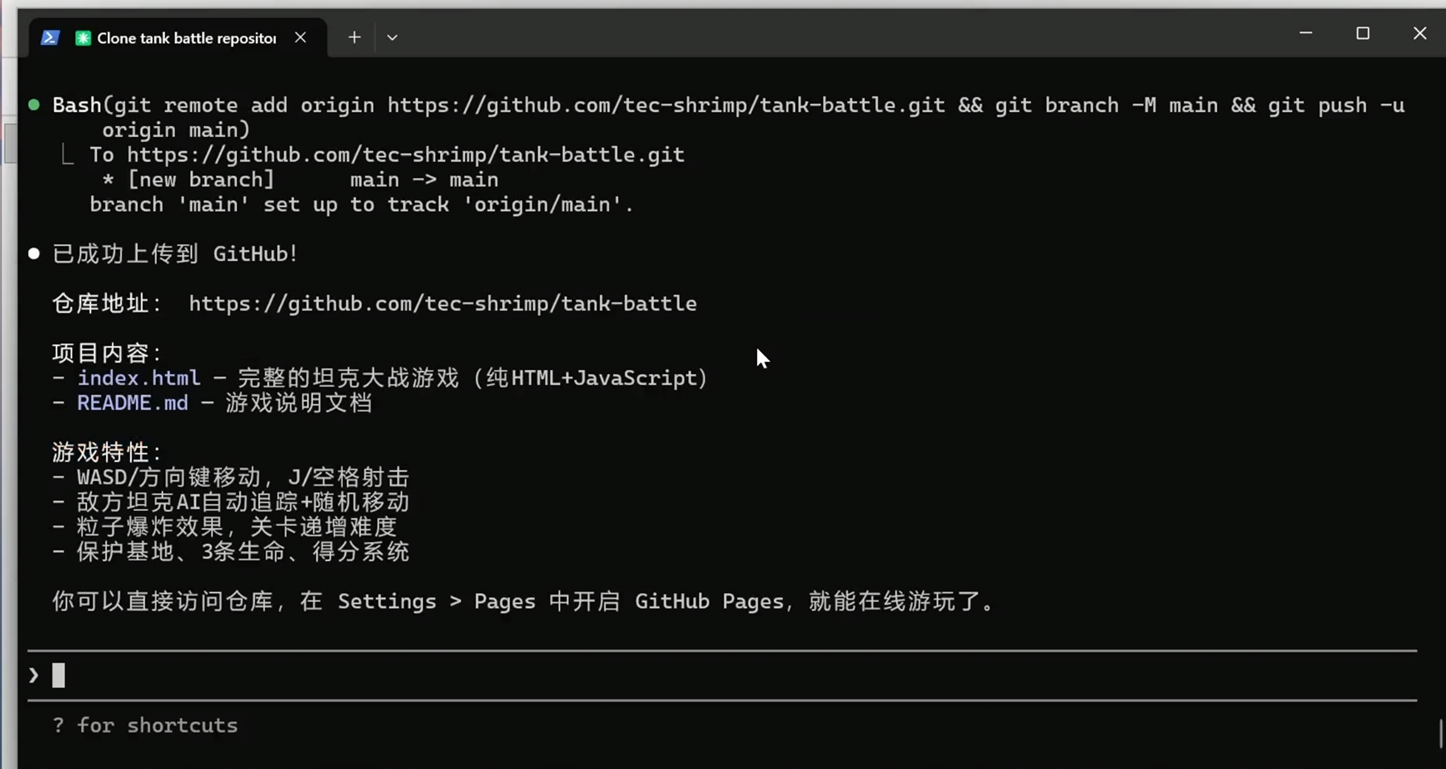 我们来看一个实战案例,把刚才的几步配置串联起来。首先在桌面新建一个文件夹,然后打开这个文件夹,右键在终端打开,输入命令 claude 来启动 Claude Code 。这里输入提示词:创建一个 html 的坦克大战,并且上传到 Github 上面变成一个仓库。