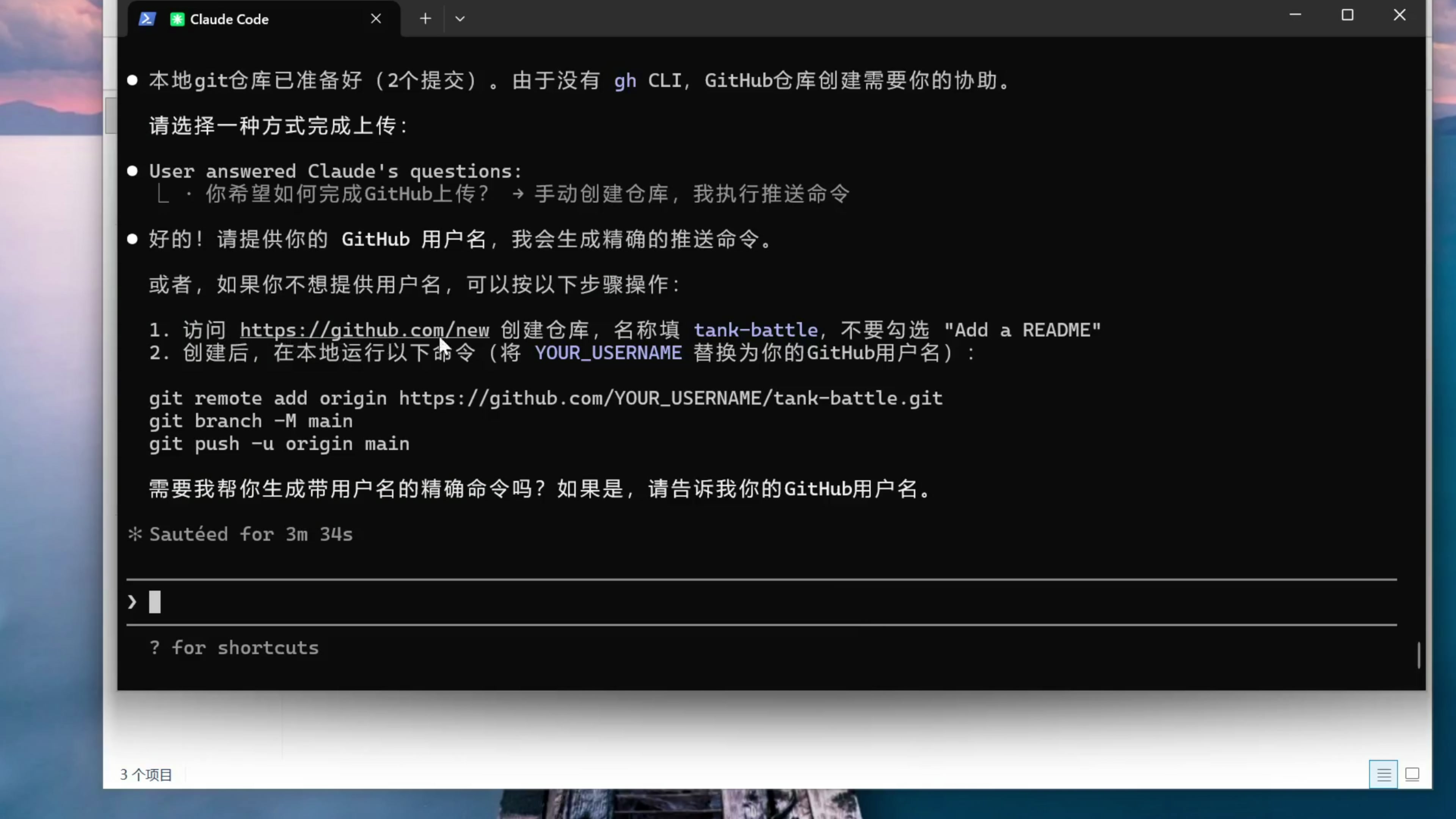 AI 在执行过程中会申请权限,这里我都选择 yes 。接下来它询问我怎么把项目上传到 Github 上面,这里我选择第二个。AI 提示我先访问这个地址创建一个仓库,我点击这个链接。