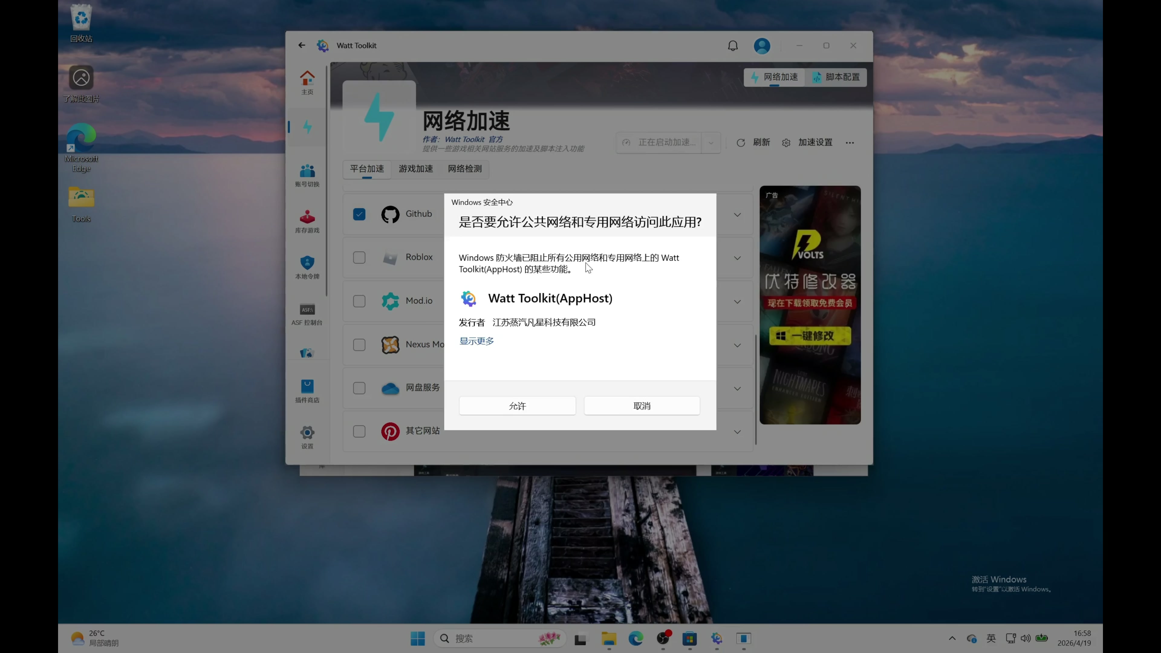 然后点击安装。安装完成以后打开软件,找到网络加速,勾选上 Github ,点击一键启动加速。