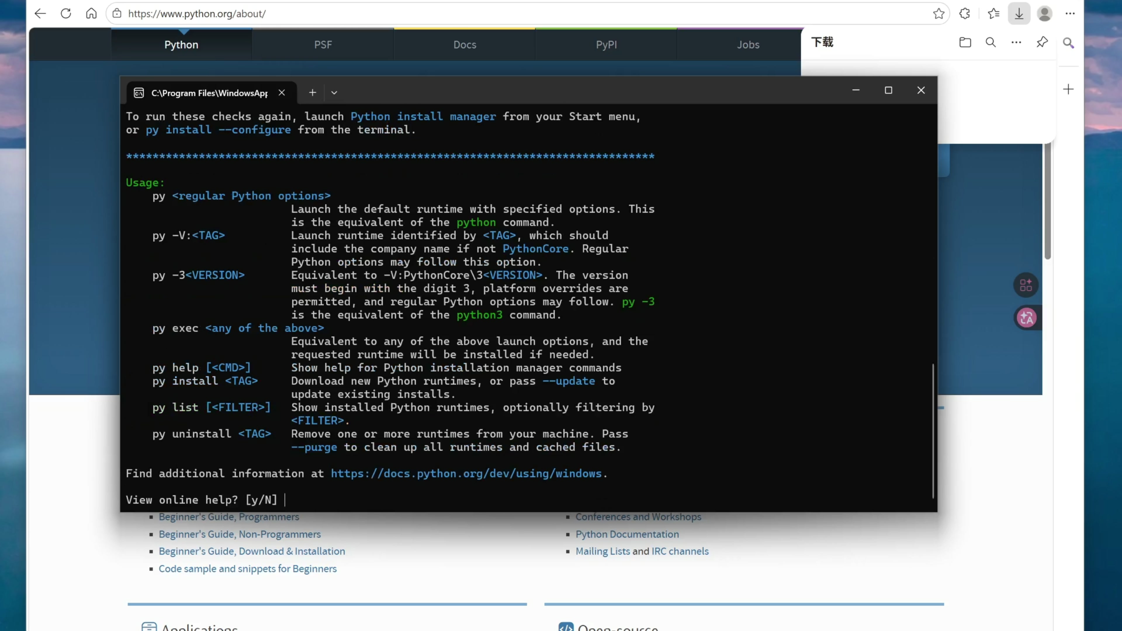 下载完成以后运行,点击 install Python 。然后会弹出一个终端窗口,我们全部输入 y 回车,这样 Python 就安装好了。