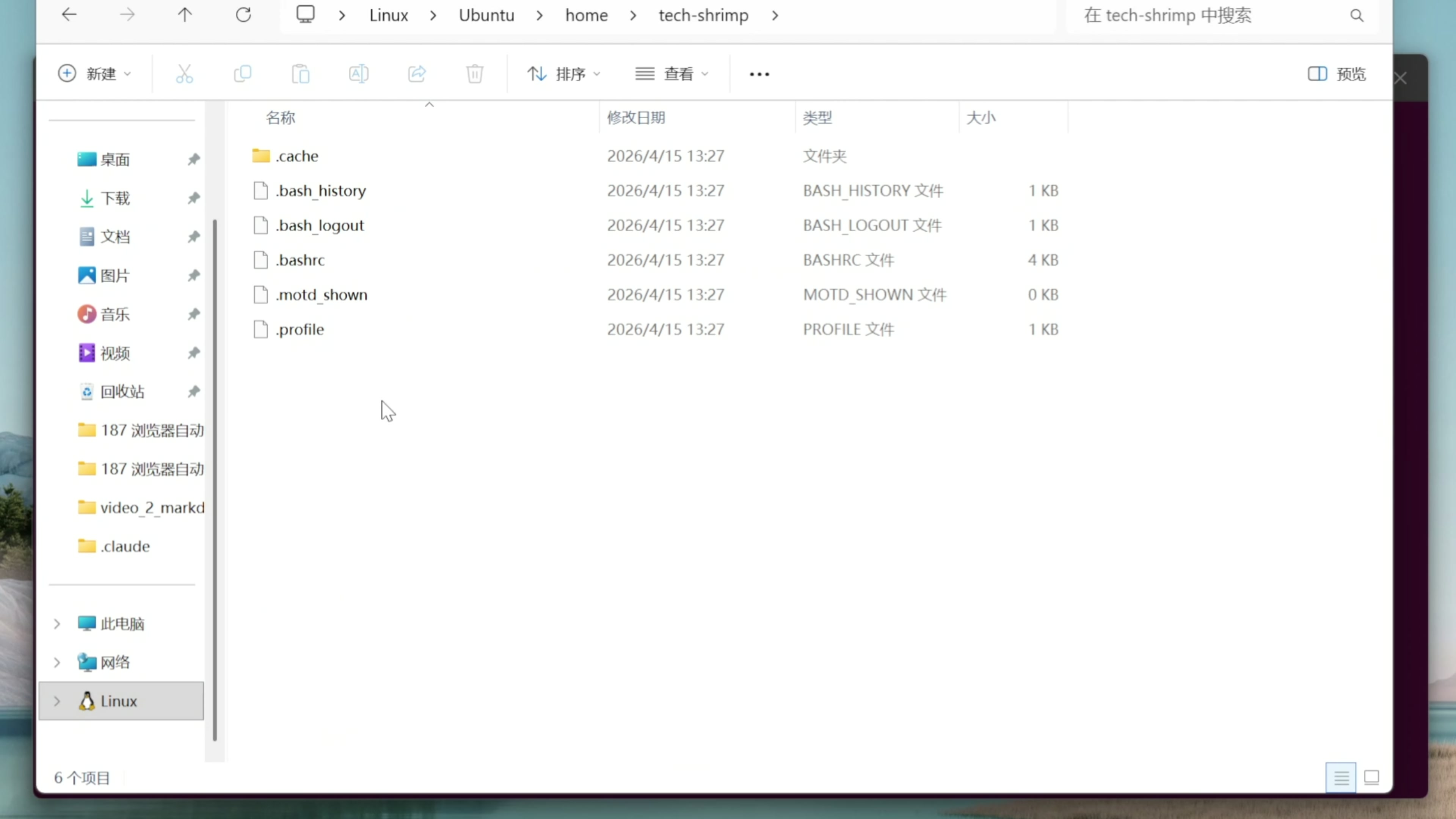 WSL 的文件系统跟 Windows 上是互通的,我们可以在 Windows 上打开我的电脑,在左下角可以看到一个 Linux 的图标,我们点击一下。这里显示了一个 Ubuntu 的文件夹,我们点击进去。这样就在 Windows 里面打开了这个 Linux 的文件系统。