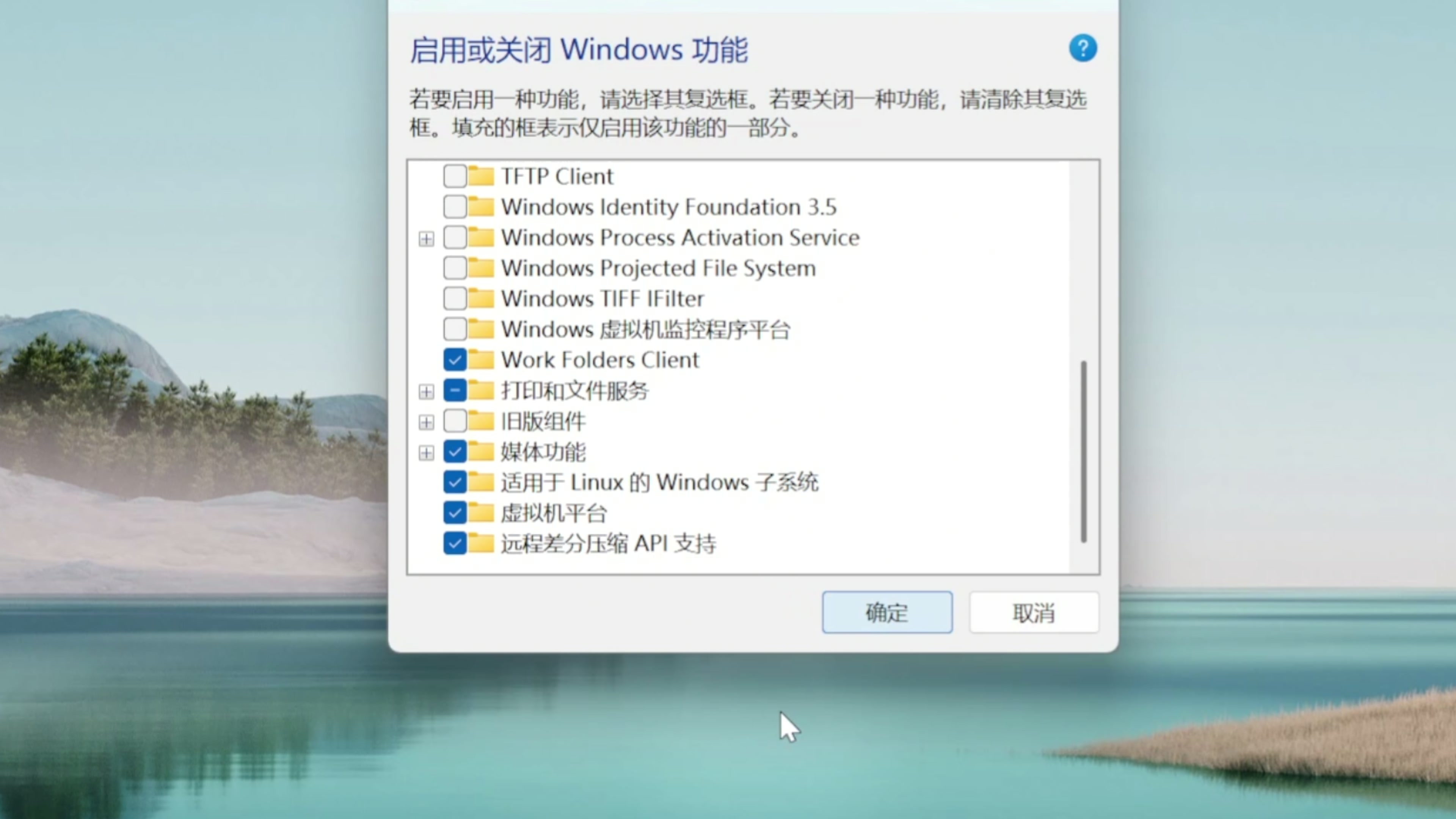 接下来我们在 Windows 电脑上安装 WSL 。WSL 的全称是 Windows subsystem for Linux ,也就是运行在 Windows 上的 Linux 子系统。开启了 WSL 以后,你的 Windows 电脑就拥有了一个 Linux 子系统。很多在 Windows 上无法安装或者表现不佳的 Agent 软件也都能很好的运行了。在使用 WSL 之前,我们需要先开启两个 Windows 功能。我们来到 Windows 的搜索栏搜索功能,选择启用或关闭 Windows 功能。然后勾选上这两个:适用于 Linux 的 Windows 子系统还有虚拟机平台。