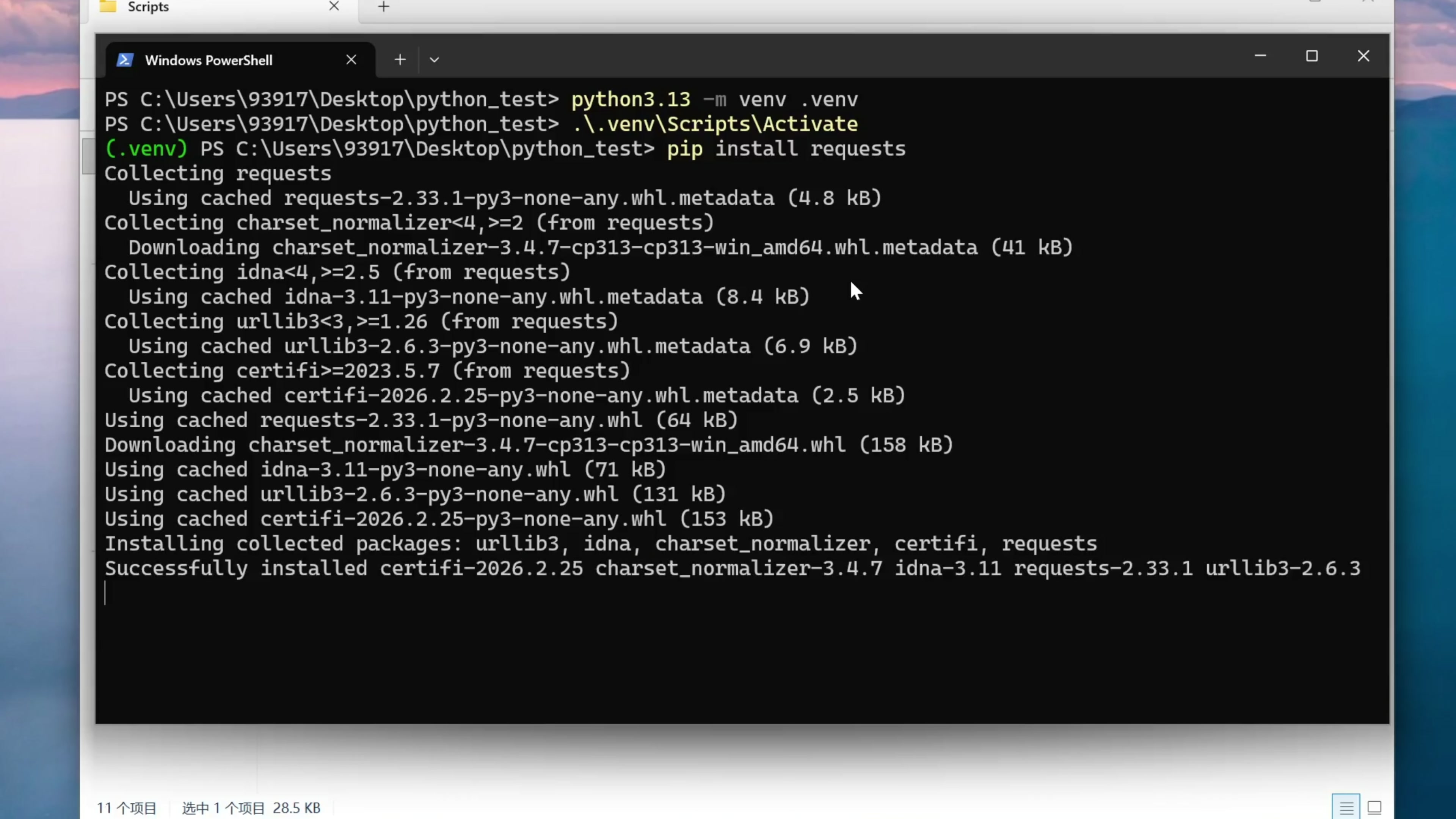 它的意思是使用 3.13 版本的 Python 在这个文件夹下面创建一个虚拟环境。接下来使用命令来激活虚拟环境,然后我们再使用 pip 命令来安装 Python 包。