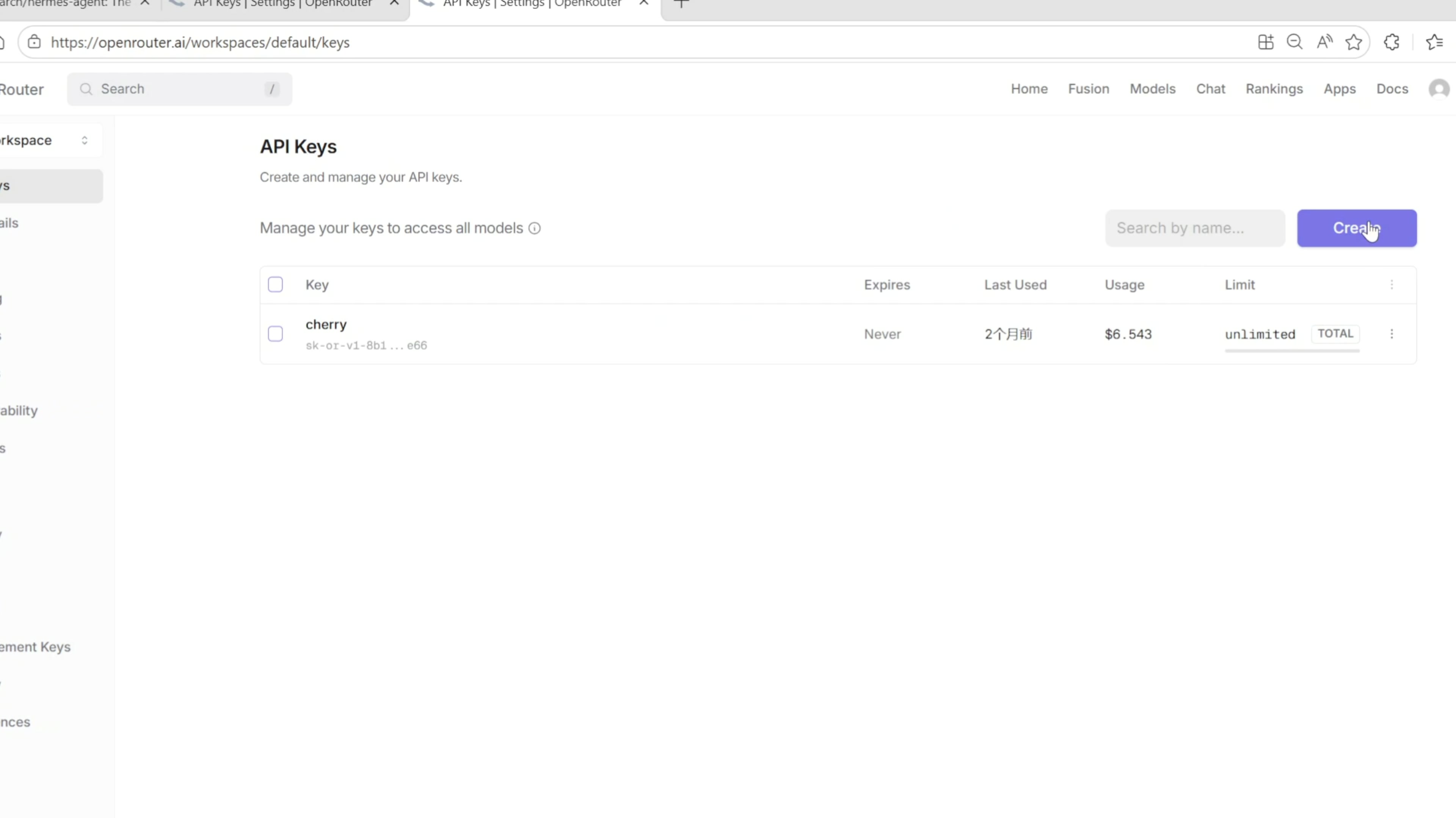 随便填写个名字,点击新建。把生成出来的这个 API key 复制下来,填写到我们的配置里面。