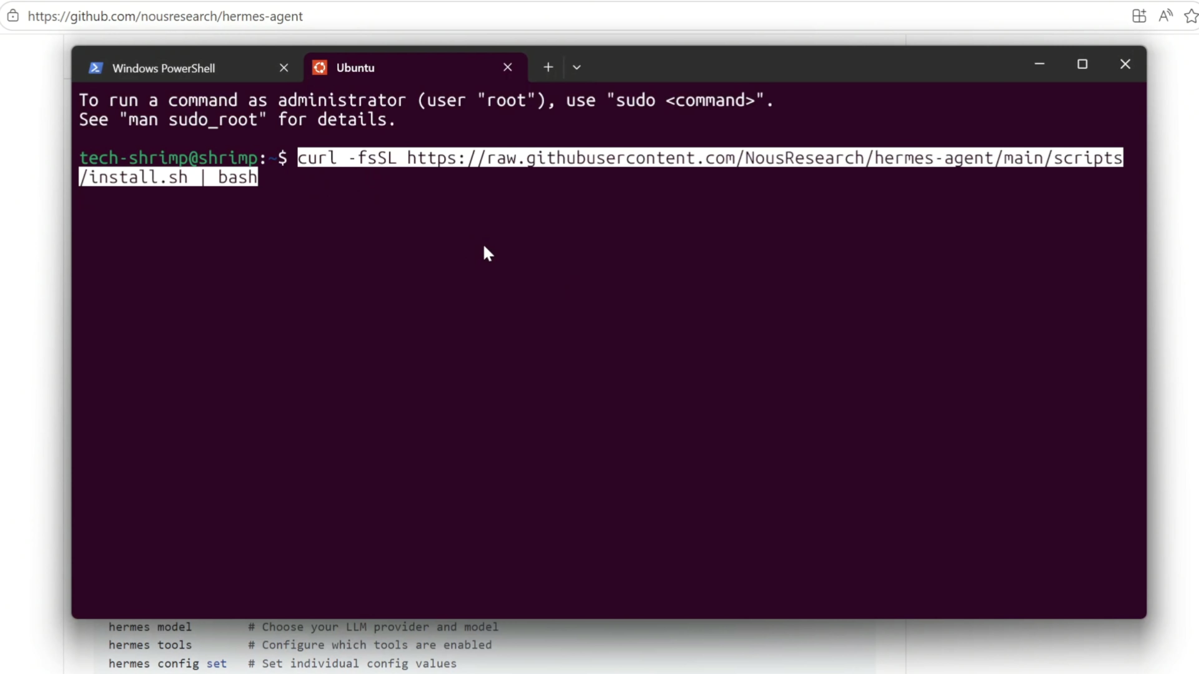 然后输入 ls 命令可以查看所有的笔记。有了 WSL 以后,我们就可以安装运行一些原本 Windows 上不支持的 AI 工具。比如这是最近很火的 Hermes Agent ,它在 Windows 上原本是不支持的,但是我们看到这里它支持 WSL 。我们只需要复制一下这个一键安装命令,来到 WSL 的窗口粘贴过来执行。