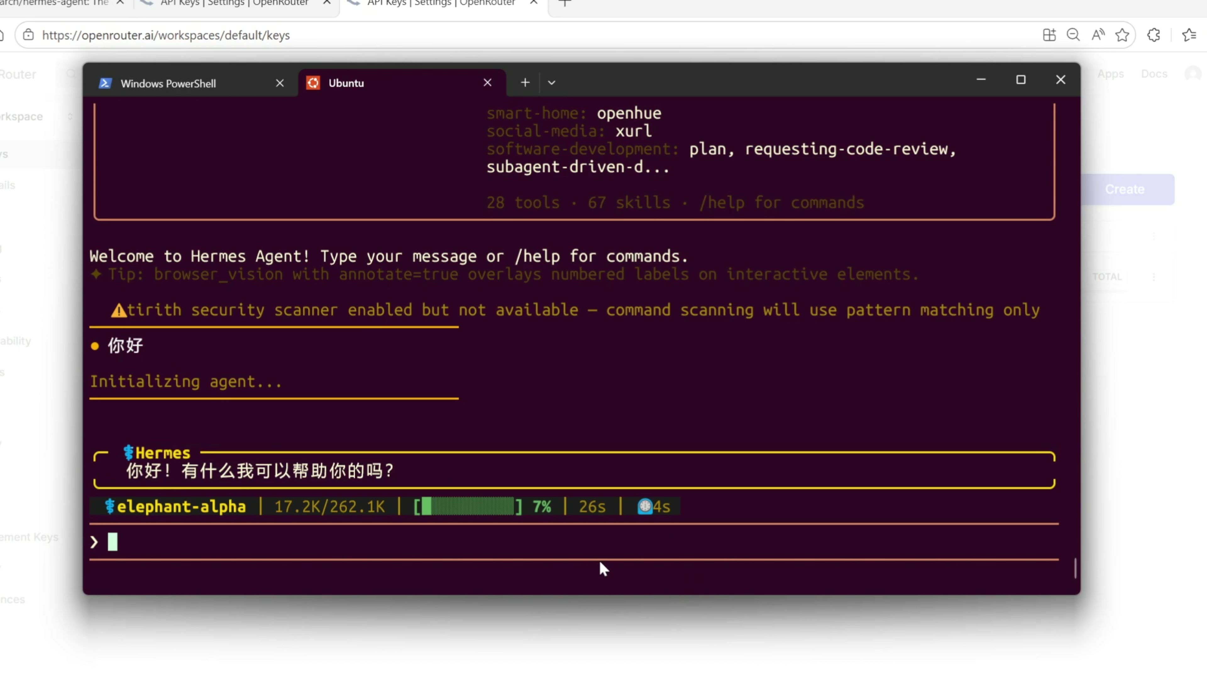 我把创建的 API key 复制一下,Ctrl+V 粘贴进 WSL 回车。接下来它让我选择模型,这里我选择这个免费的模型回车。然后我们按照提示启动 Hermes Agent 的聊天功能,里打个招呼,给到了回复,我们的 Hermes Agent 在 WSL 上也安装成功了。
