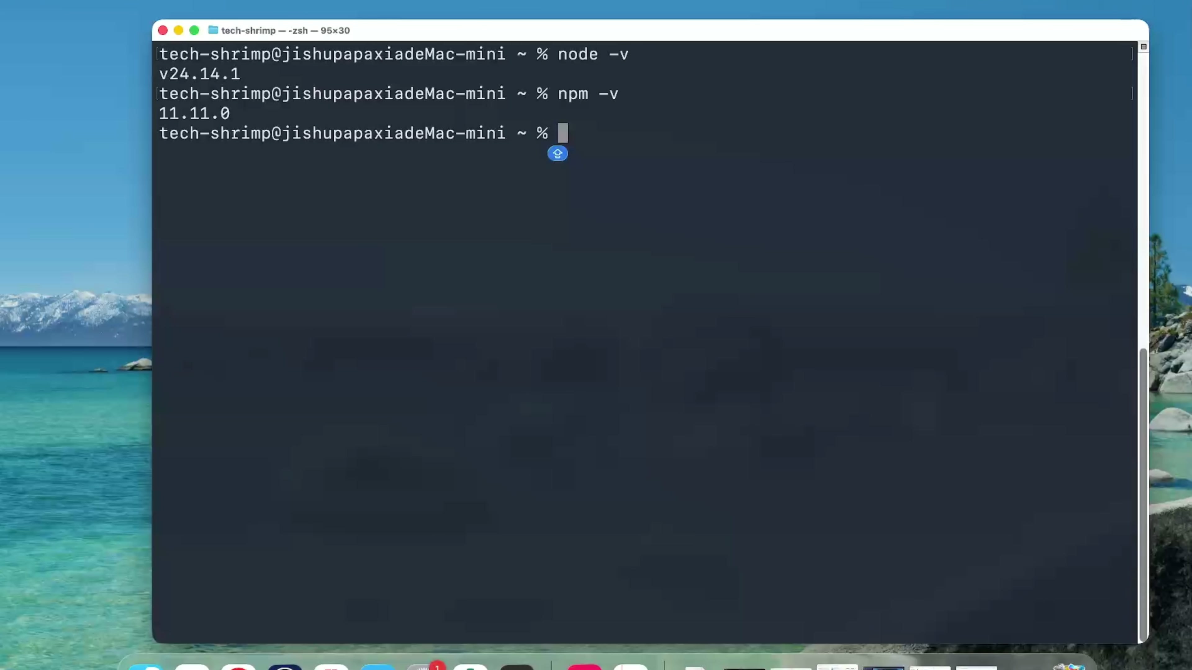 我们在 APP 里面找到终端打开终端,先输入 touch 创建一个 shell 的配置文件,然后把下面几个命令复制过来依次执行。这样就把 nodejs 24 安装到了电脑上。然后我们输入命令 node -v 还有 npm -v ,这里都成功打印出了版本号,我们的 nodejs 就安装完成了。