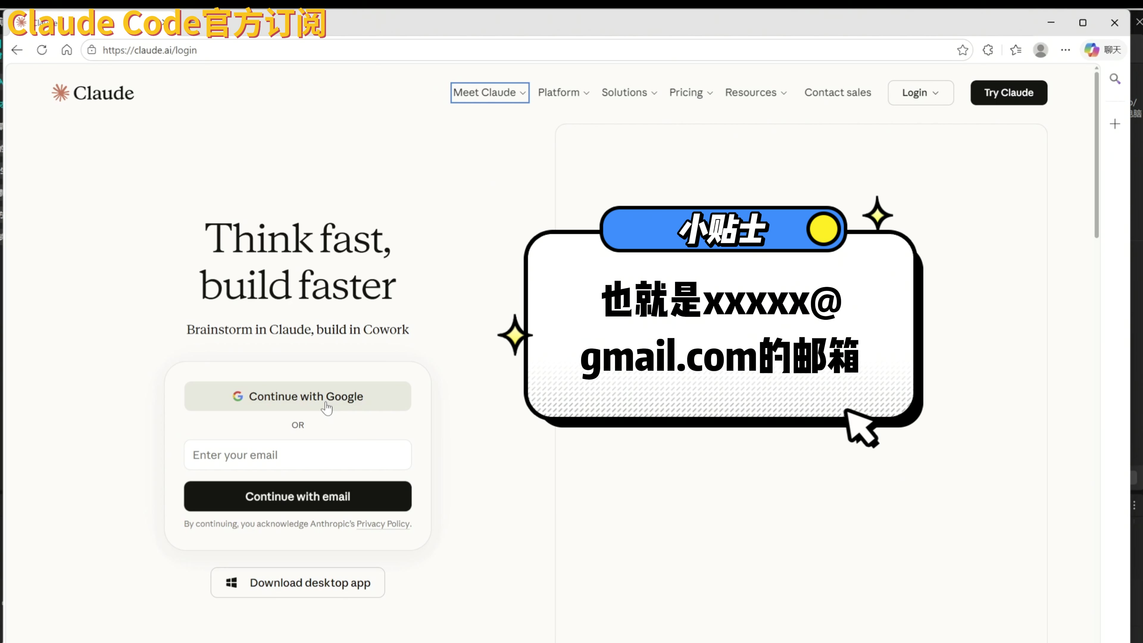 接下来我再简单介绍下怎么获取一个 Claude 的官方订阅。我们来到 Claude 官网,注意这里一定要选择使用谷歌账号进行登录,而且这里要注意你的谷歌账号的邮箱必须是 Gmail 的。