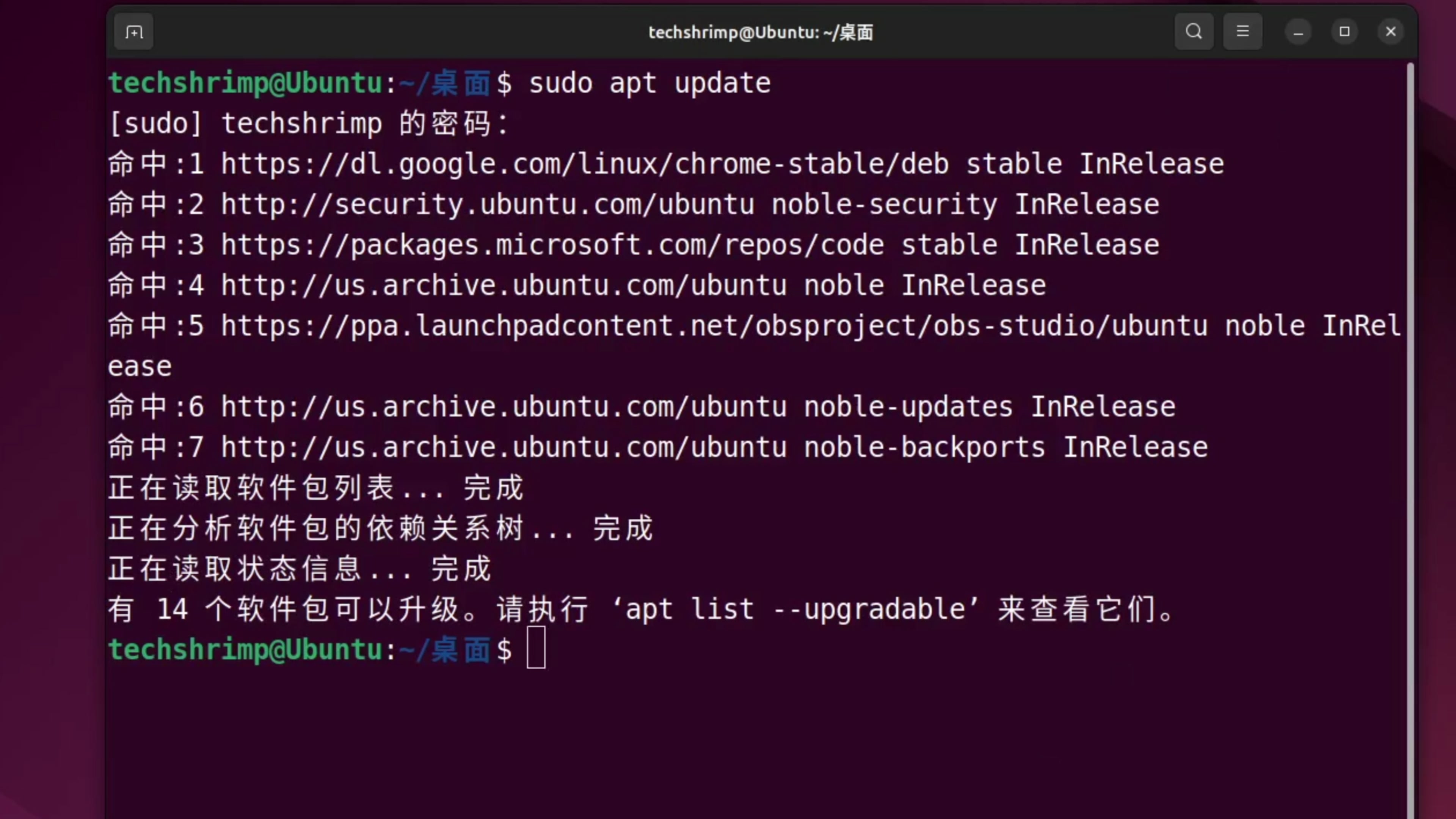 更新一下 apt 索引,填写我们电脑的密码回车,这样就更新完成了。