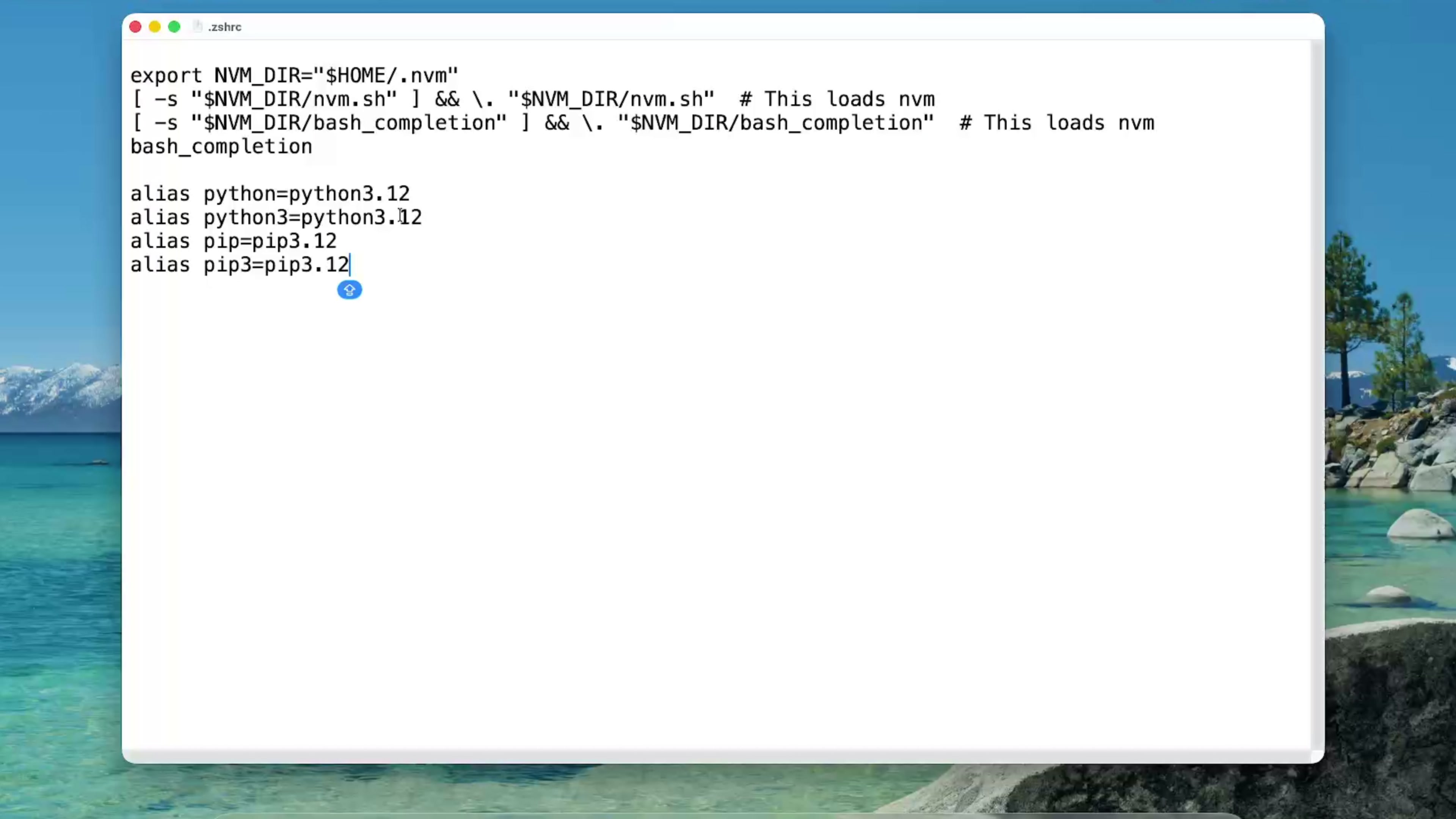给我们的电脑安装 3.12 版本的 Python ,等待了一会就安装完成了。我们打开访达,点击用户名进入主目录,找到这个.zshrc 文件双击打开。添加这么 4 行,它的意思是把 3.12 版本设置成 Python 的别名,然后按 command+s 保存一下。