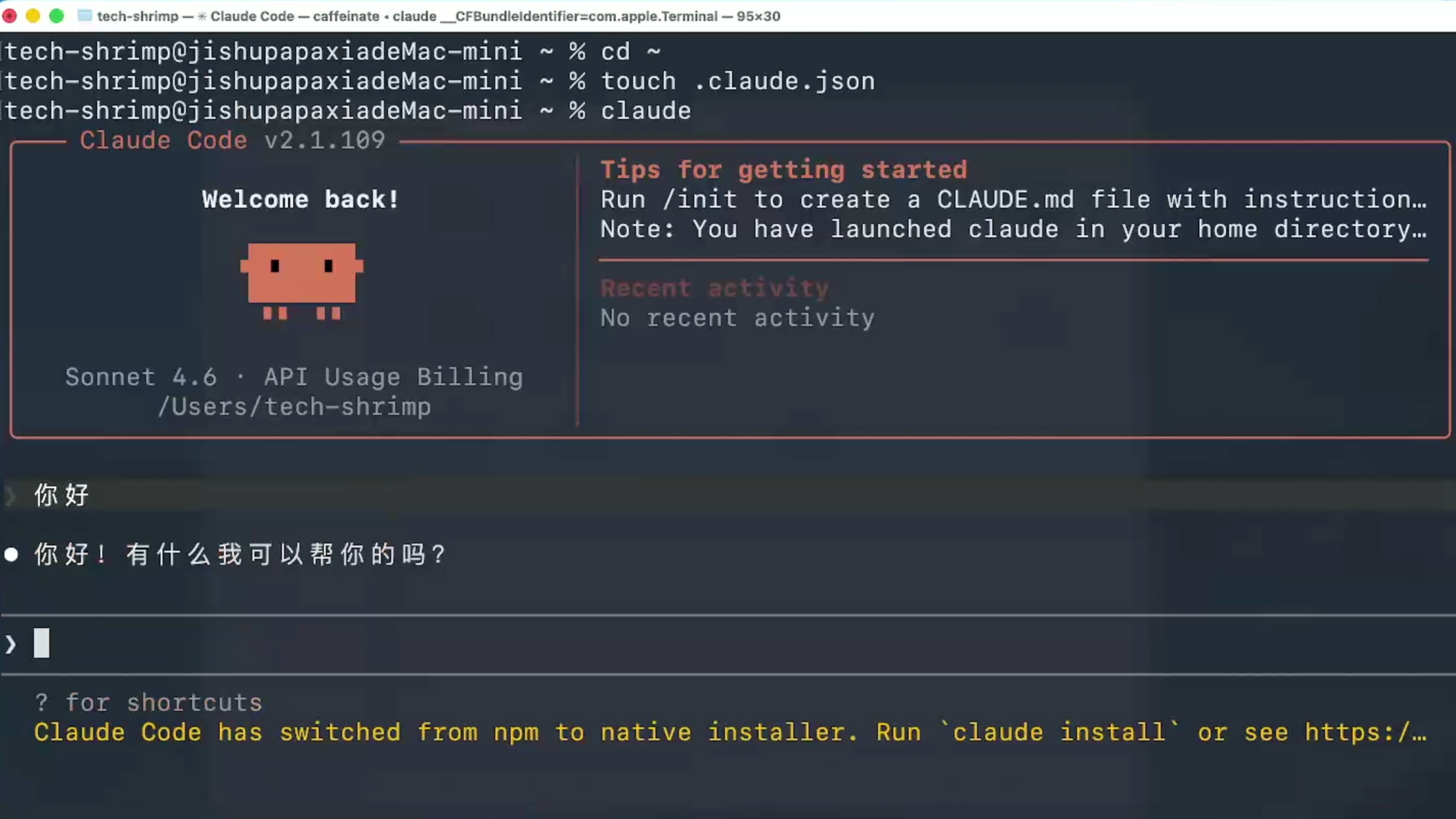 按 command+s 保存一下这个配置文件,然后我们还是回到终端,输入命令 Claude 来启动 Claude Code 。这里选择第一个信任当前文件夹,然后会弹出一些授权窗口,我们都点击允许,打个招呼,这里成功给到了回复,我们的 Claude Code 就配置完成了。