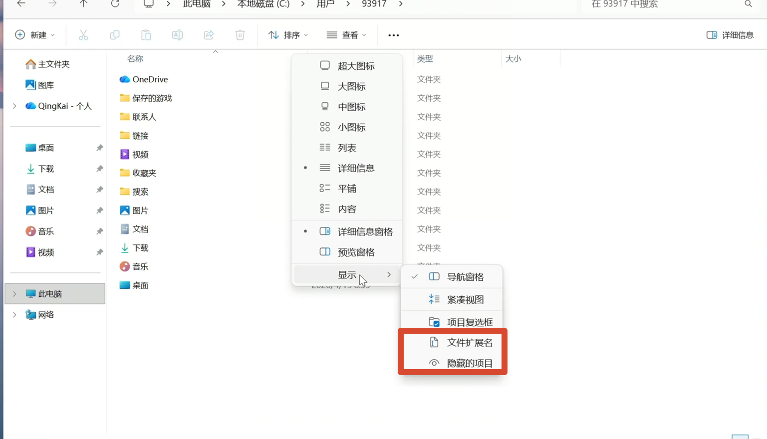 接下来我们对 Claude Code 进行一个基础设置,让它使用国内的模型先跑起来,等下我再简单介绍怎么获取一个 Claude Code 的官方订阅。这里我们来到 C:/Users/你的用户名 这个文件夹。在顶部菜单点击查看,勾选上显示隐藏文件夹,还有文件扩展名。