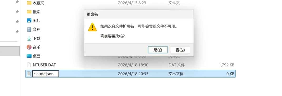 接下来我们在这个目录右键新建文本文档,然后把我们新创建的文件的名字改成 .claude.json。