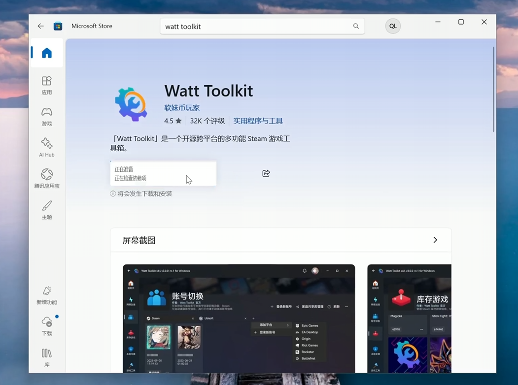 接下来我们解锁 Github 。刚才我们介绍了 Git ,这是一个版本控制软件,Hub 的意思是中心汇聚集合,全世界的开发者会把自己用 Git 进行版本控制的仓库,也就是一个个的文件夹,上传到 Github 的网站上面,这个网站就是 Git 仓库的集合,也就是 Hub 。所以 Git 加 Hub 就是 Github ,它是全球最大的代码仓库托管与协作平台。在国内网络使用 Github 经常会因为网络问题导致超时或者打不开。我们在搜索栏搜索 store ,然后打开 Microsoft store ,搜索 Watt Toolkit 这款开源免费的软件,