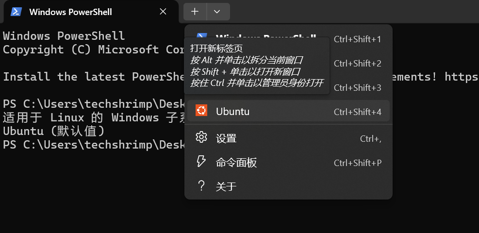 这里显示的 Ubuntu 就是我们的 Linux 子系统。Ubuntu 是目前最流行的 Linux 发行版,是 WSL 默认安装的版本。我们在顶部点击加号,在下拉列表里面就能找到我们的 Linux 子系统,点击 Ubuntu 就进入了子系统。
