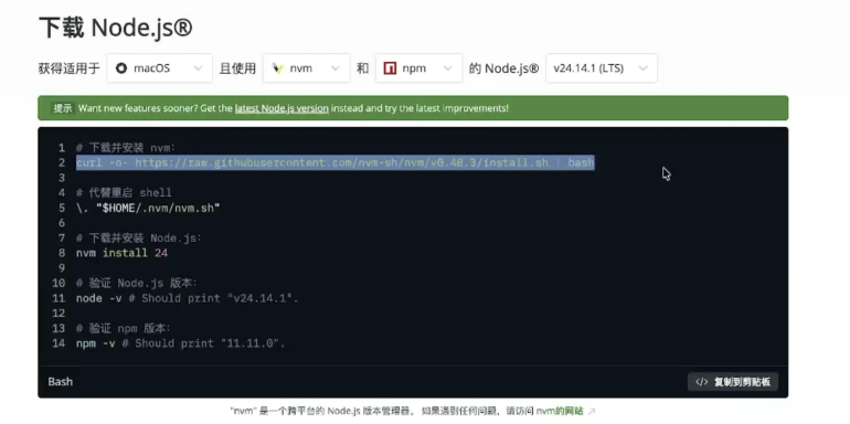 我们看到 Git 已经帮我们安装好了。接下来我们来安装 nodejs 。注意这里有一个大坑,就是千万不要使用 nodejs 的官网安装包,安装包会把 nodejs 安装到 root 目录,后续会出现很多的权限问题。这里我们还是来到 nodejs 的官网,一定要选择使用 nvm 的安装方式,把下面这几个命令在终端里面依次执行一遍。