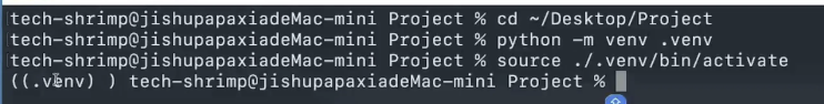 以后在命令行里面不论输入的是 python 还是 python3 ,都是使用的 Python3.12 版本。这里有个注意事项,使用 HomeBrew 安装的 Python ,直接在终端执行 pip 命令尝试安装 Python 依赖会报错,HomeBrew 禁止全局安装 Python 依赖,也就是说我们必须使用虚拟环境。使用虚拟环境是 Python 最推荐也是最标准的做法。我们先创建一个项目文件夹,然后在终端里面使用 cd 命令进入文件夹。接下来输入这个命令在项目文件夹创建虚拟环境,然后下一条命令激活新创建的虚拟环境。
